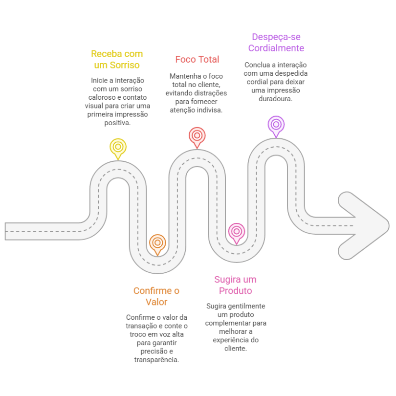 Mantenha o caixa limpo, os documentos organizados e as notas/troco separados por valor. Facilita seu trabalho e evita equívocos. - Despedida cordial: