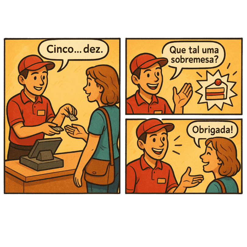 Repita o valor recebido (“São cinquenta reais, certo?”) e conte o troco em voz alta. Isso transmite confiança e reduz erros. - Sugestão de complemento (upselling):