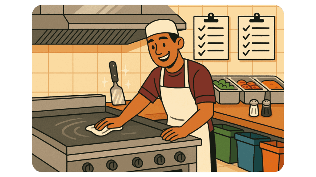 - Cronograma de limpeza: Combine com a equipe um check-list de tarefas de limpeza para cada turno, garantindo que ninguém fique sobrecarregado.