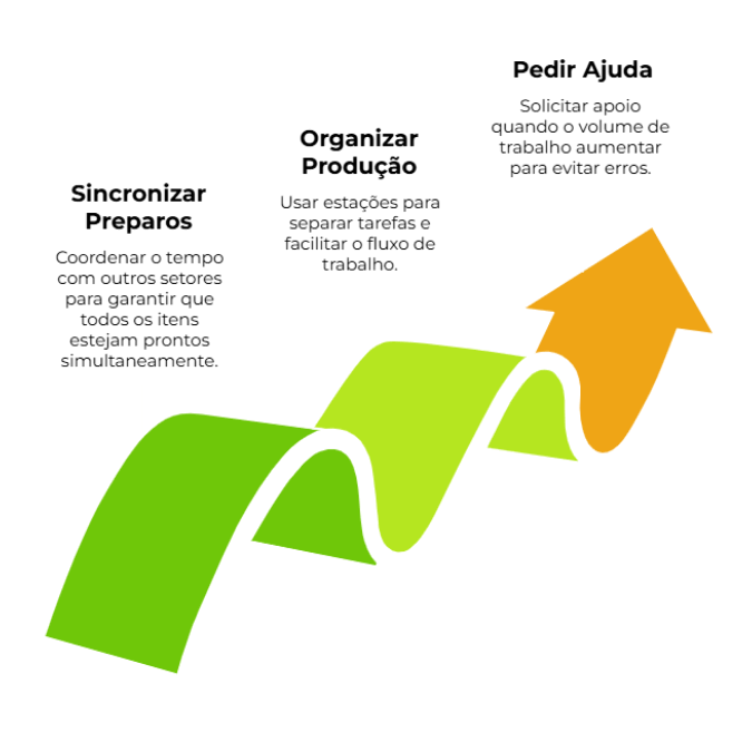 - Sincronize os preparos: Coordene seu tempo com os outros setores da cozinha. Só finalize o lanche quando o acompanhamento ou bebida também estiverem prontos, evitando que um item esfrie enquanto o outro atrasa.