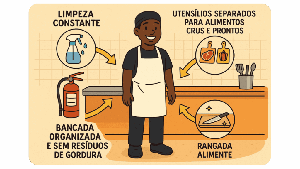• Organização da bancada: Separe bem os espaços de alimentos crus e cozidos. Mantenha o ambiente seco e sem excesso de gordura ou lixo acumulado.